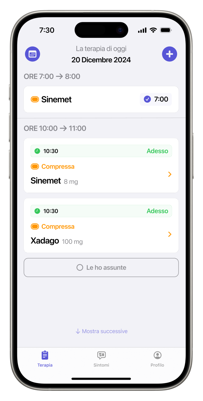 Gestisci la tua terapia, imposta notifiche personalizzate e monitora i sintomi più comuni.